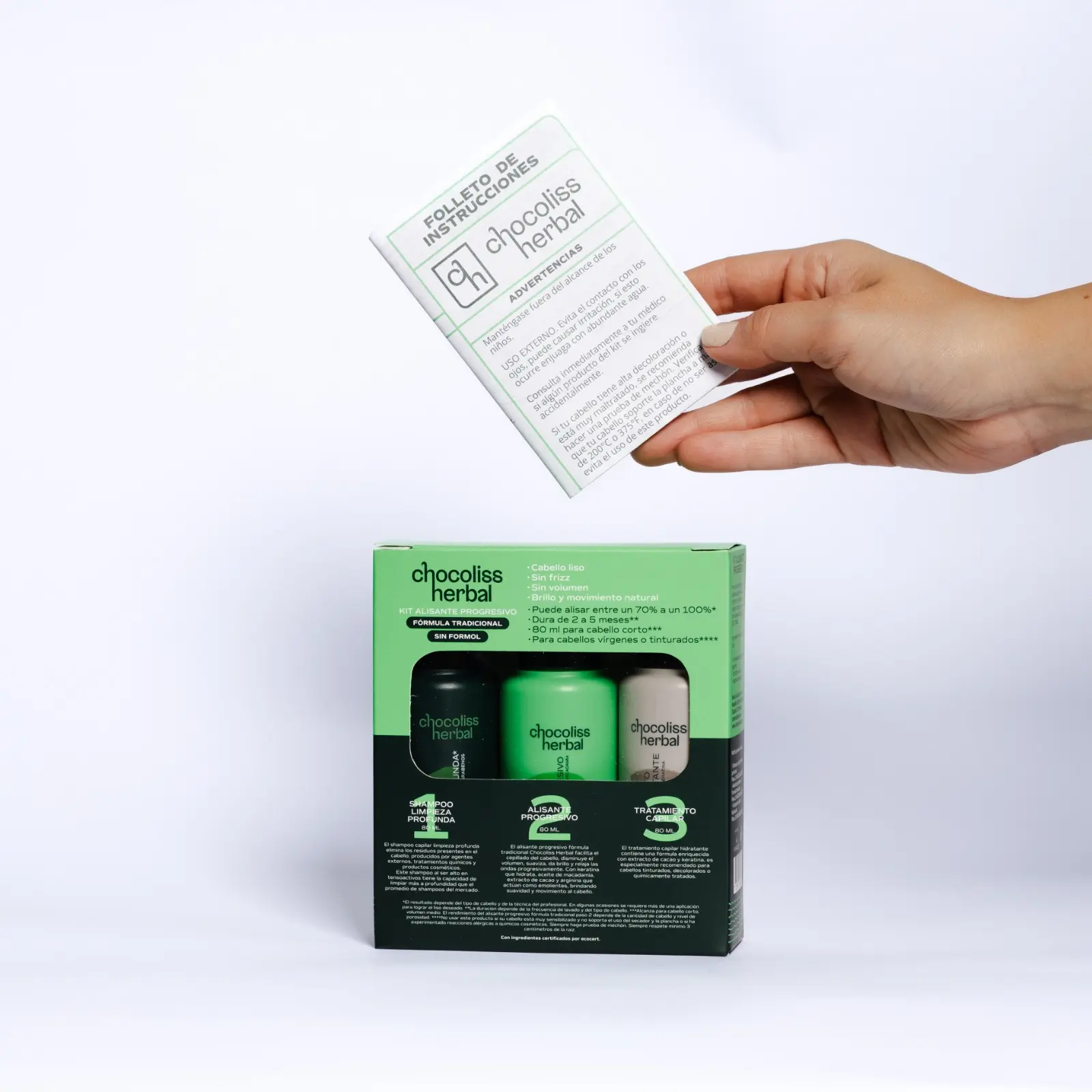 Para empezar, el ChocoLiss Herbal Kit elimina la espera. Es un alisante progresivo que garantiza resultados visibles inmediatamente. De hecho, puedes obtener un cabello liso entre un 60% y un 100% [info provided] al instante y ver el resultado final el mismo día [info provided].