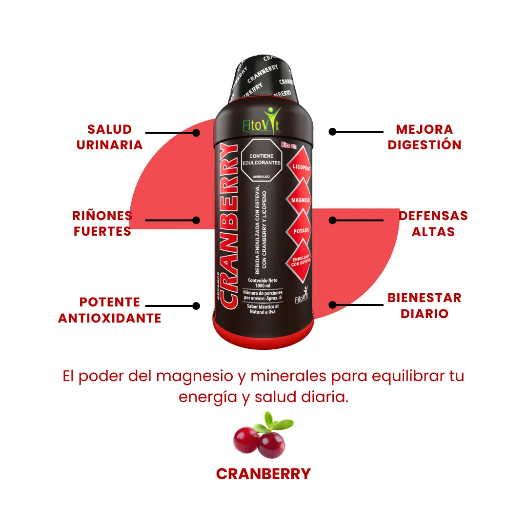 ¿Buscas un aliado natural potente para prevenir infecciones y cuidar tus riñones? ¡La solución líquida más avanzada para la salud urinaria está aquí! Nuestro Cranberry X1000 FitoVit es una bebida funcional endulzada con Stevia , que combina el poder protector del Cranberry (2.0%) con el antioxidante Licopeno (1.0%). Por lo tanto, es el suplemento líquido ideal para la salud renal, urinaria y la defensa celular.