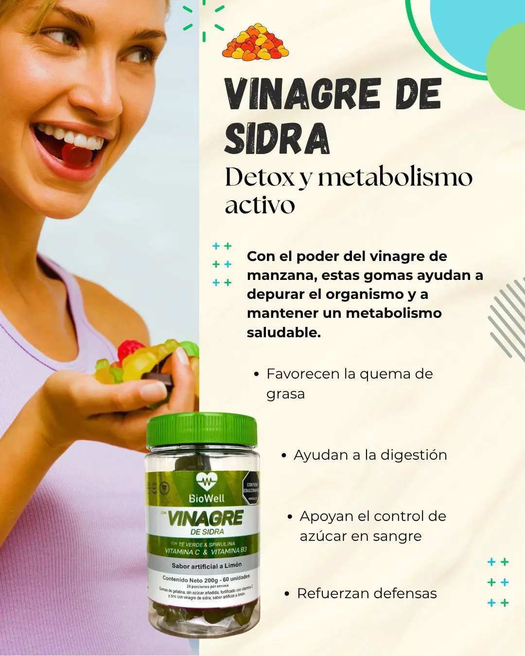 ¿Quieres disfrutar de los legendarios beneficios del vinagre de sidra de manzana pero no soportas su sabor fuerte y ácido? ¡Tenemos la solución perfecta! Las Gomas de Vinagre de Sidra Biowell han sido diseñadas para quienes buscan cuidar su peso y su digestión de una forma práctica, efectiva y, sobre todo, deliciosa. Por lo tanto, si estás listo para transformar tu metabolismo sin sufrir con cada toma, estas gomitas son el impulso que tu cuerpo necesita.