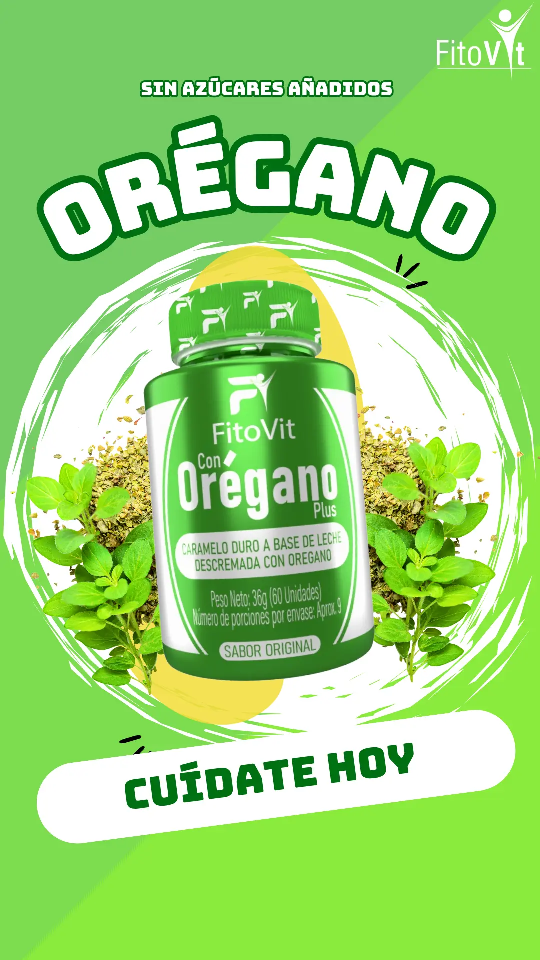 ¿Buscas una forma práctica y deliciosa de fortalecer tu sistema inmunológico y aliviar las vías respiratorias? ¡Finalmente, un caramelo que te cuida por dentro! Nuestro Orégano Plus FitoVit es un alimento masticable funcional a base de leche descremada y Orégano (14%) , enriquecido con una potente mezcla de vitaminas y minerales. Por lo tanto, es el aliado perfecto contra resfriados y congestión.